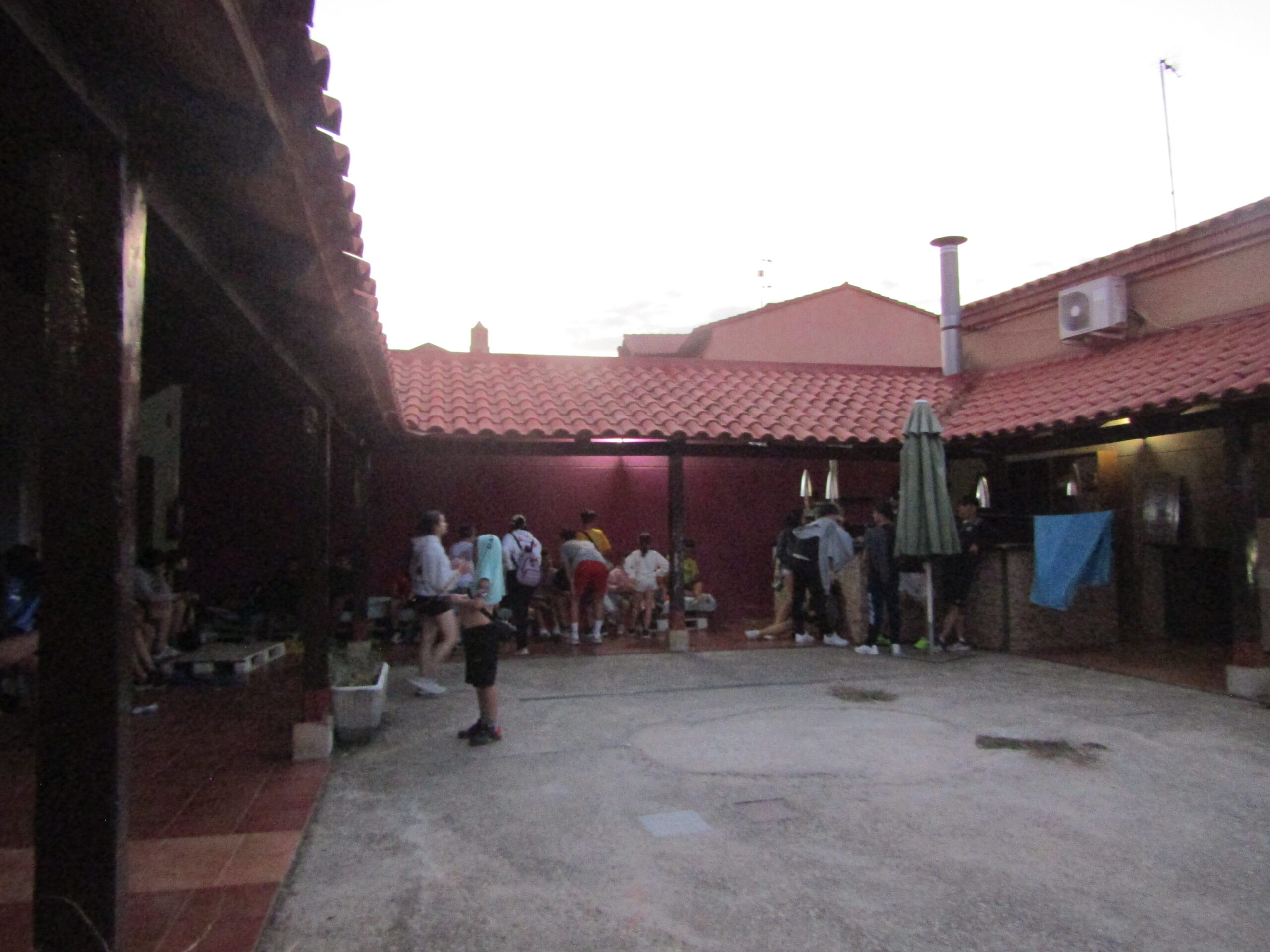 Como cada tarde, después de merendar, organizamos un emocionante torneo de guiñote. A continuación, comenzamos a preparar las actuaciones para la noche en el patio… pero la tormenta nos sorprendió con lluvia intensa y hasta granizo. ¡Cambio de planes! Tuvimos que reorganizar todo dentro del comedor y sus alrededores. Una vez listas, las actuaciones se celebraron en el vestíbulo: ¡todas fueron geniales, creativas y muy divertidas!